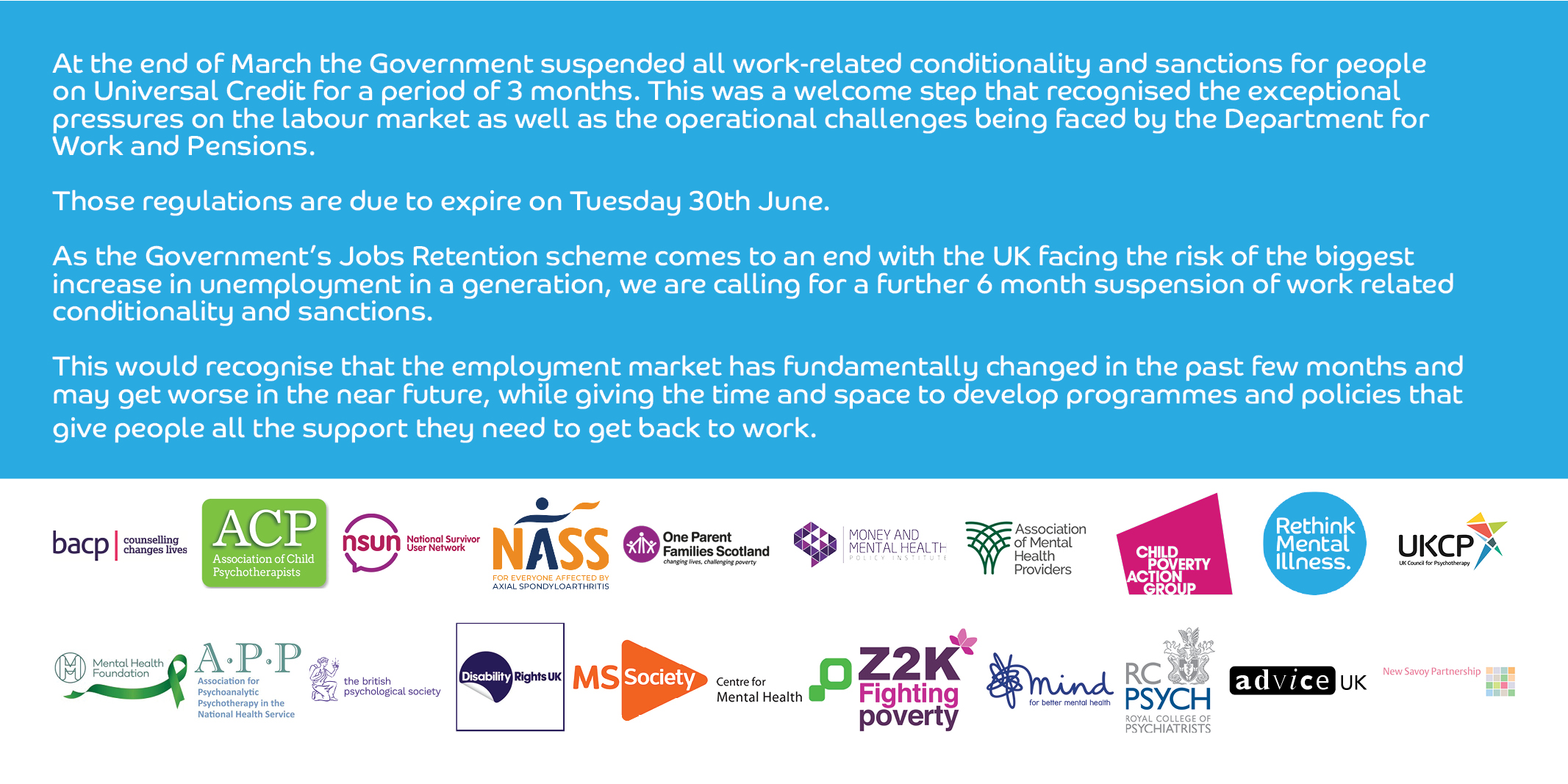 As the Government’s Jobs Retention scheme comes to an end with the UK facing the risk of the biggest increase in unemployment in a generation, we are calling for a further 6 month suspension of work related conditionality and sanctions. This would recognise that the employment market has fundamentally changed in the past few months and may get worse in the near future, while giving the time and space to develop programmes and policies that give people all the support they need to get back to work.